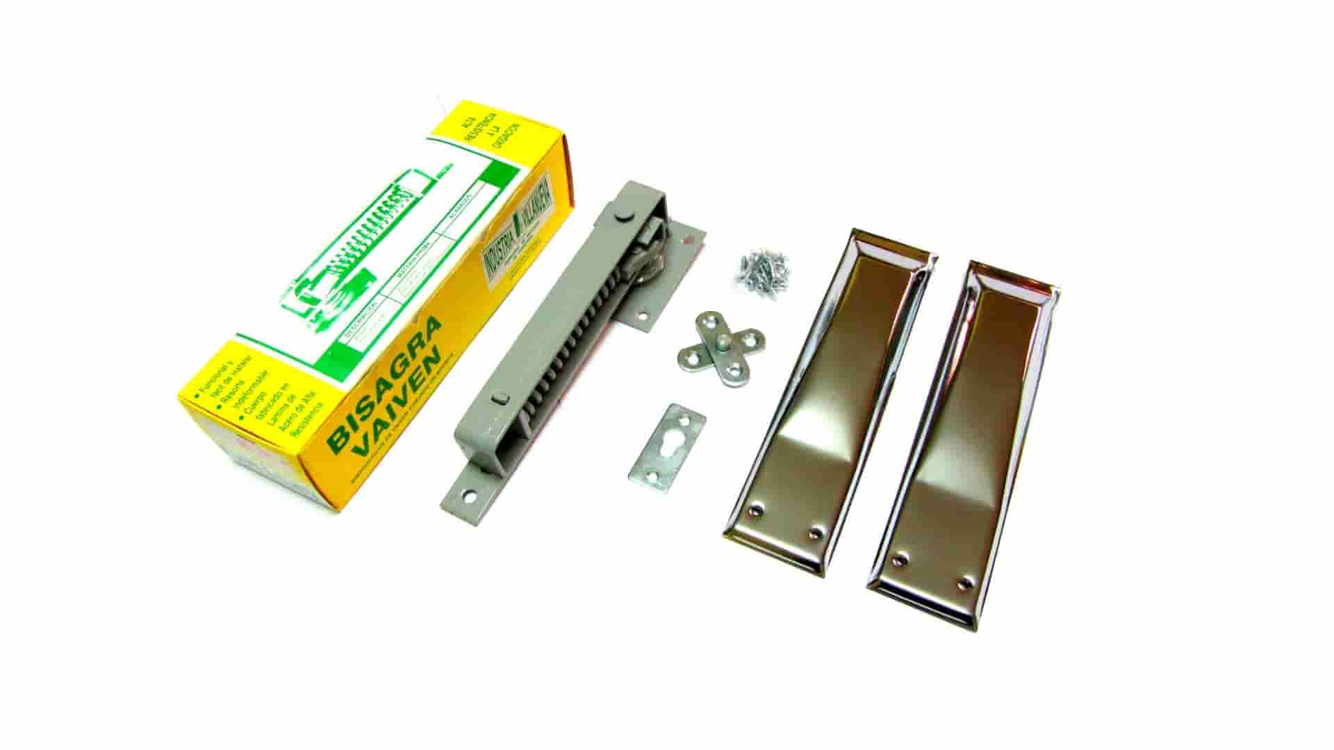 Bisagras Vaivén de doble acción. Frecuentemente utilizadas para puertas de restaurant, hoteles y hospitales, en los cuales la necesidad es que la puerta se abra y cierre sola tanto al ingresar como al salir. Por sus características tiene una retención de 90 grados en ambos sentidos.